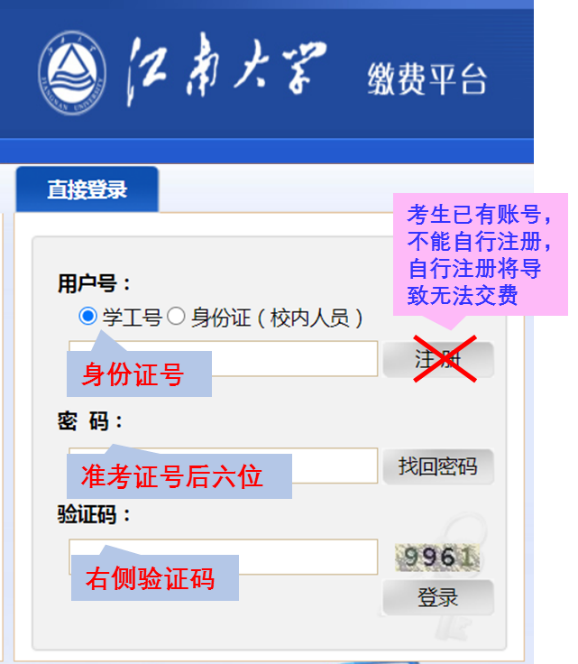 缴费说明:进入复试考生在学院规定的时间内登录“欧博abg官网登录入口缴费平台”交纳复试费用,复试收费标准:80元/生。考生搜索微信公众号“欧博abg官网登录入口财务处”,在“业务办理”中选择“学生缴费”,或登录“欧博abg官网登录入口网上缴费平台”(网址:http://pay.jiangnan.edu.cn/payment/);登录账号为身份证号,登录密码为准考证号后六位(友情提醒:考生账号已开通,切勿自行注册)。按照提示交费,并打印或截图保存付费凭证。