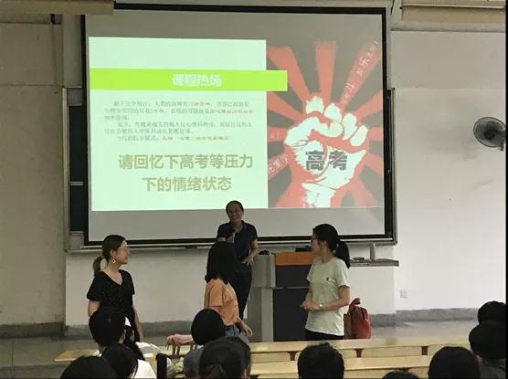 讲座气氛活跃、内容充实,同学们在沈老师的指导下,以游戏的形式探索自我、认识自我。一幅“雨中的我”帮助同学们分析了自身的性格构成,一出“老板—爸爸—妈妈—儿子—猫”的情景剧展示了情绪管理的重要性,两个对梦完全相反的解读诠释了心理暗示的力量……除此之外,沈老师还以专业知识搭配趣味解说同研究生分享了压力应对和情绪管理的策略。