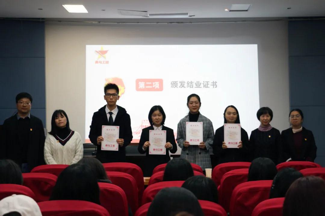 仪式上,首先由第二届青马训练营优秀学员代表陆梦欣同学发言。她和同学们分享了自己在青马的学习和成长。随后,四位领导老师分别为结业代表颁发了结业证书。接下来,第三届青马训练营学员代表廖闻渊同学作为新学员代表发言,向全体新学员发出倡议,在青马训练营中努力提高自身思想道德素质,增强奉献意识、服务意识、责任意识,锻炼品格意志,提高为同学服务的工作水平,争做优秀“青马人”。紧接着,两届青马学员在团歌声中进行了营旗交接,营旗是青马精神的象征,营旗交接,则是意在将青马精神薪火相传,接过营旗后,四位老师又为新学员代表佩戴了写有本人姓名的青马徽章。