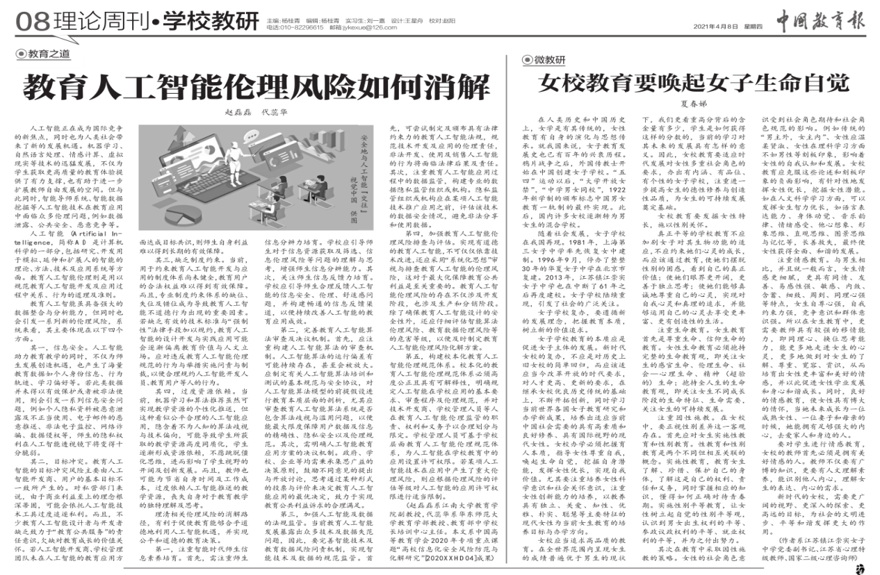 2021年4月8日,欧博abg官网登录入口90后青年教师赵磊磊副教授在《中国教育报》以第一作者发表理论文章《教育人工智能伦理风险如何消解》,中国教育新闻网、光明网等多家媒体相继转载,引发广泛关注。