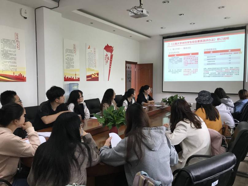 为了进一步完善学生综合素质评价体系,4月28日,在田家炳楼209会议室召开学院本科生综合素质测评细则解读会,会议由张雅静老师主持,各年级班团、班干部、学生代表参加了本次会议。