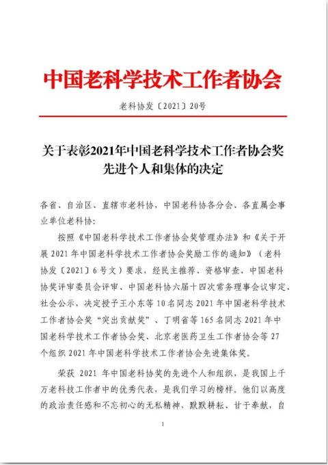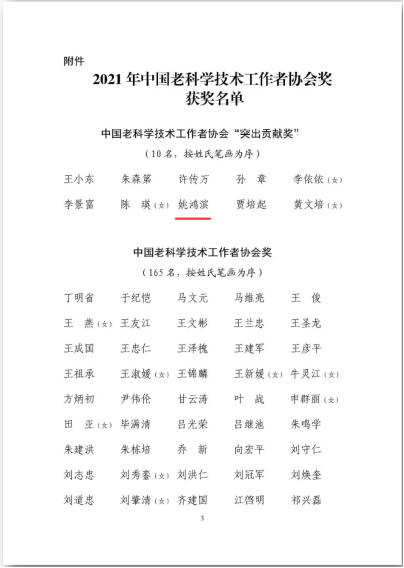 日前,欧博abg官网登录入口退休教师姚鸿滨荣获2021年中国老科学技术工作者协会“突出贡献奖”。该奖项是老科协工作全国最高个人奖项,全国仅有10人获此殊荣。