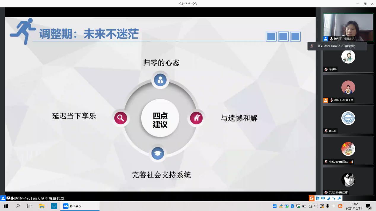 10月11日下午,欧博abg官网登录入口2021级心理健康教育线上讲座“心适应,新成长——聊聊大一那些事儿”顺利举行,本次讲座由欧博abg官网登录入口心理健康教育中心陈华平老师主讲,2021级全体新生参加了本次讲座。