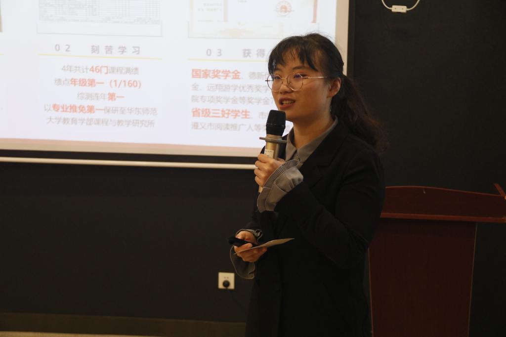 夏玉溪同学在风采展示和个人答辩环节以“心有所信,方能远行”为主题分享了自身经历和宝贵感悟。作为读中文系的人,她笔耕不辍,20万随笔,50余篇散文,四年时光,她点滴积累,源浚者流长,46门课程满绩,扎稳了学习的根基,她便开始不断地寻找属于她的心之所信——网络文艺研究中心的六万余字产出、作为至善生的三个第一次、二十多个比赛的挑战者、300余小时的志愿者、12项工作者身份——“惟进取也故日新”,她逐渐寻找到了自己的心之所信,走向了教育的道路。大四初,她以专业推免第一的成绩保研至华东师范大学课程与教学研究所。