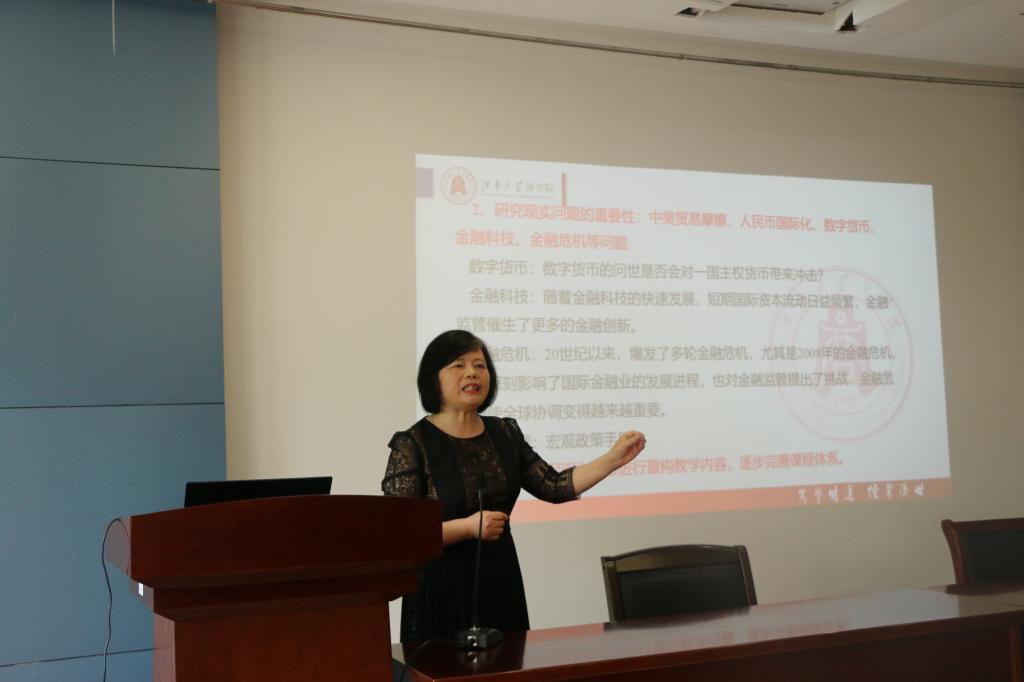随后,商学院谢玉梅教授以“国际金融”此门课程为例,阐述其关于课程思政如何实践的经验与思考。基于立德树人、以学生为中心的教学理念,与相对应的课程理念,谢教授向大家展示了课程思政设计的完整思路,着重论述了课程目标,梳理了课程体系,将课程特有属性与思政育人功能紧密结合,做到把课程思政贯穿教育教学全过程。