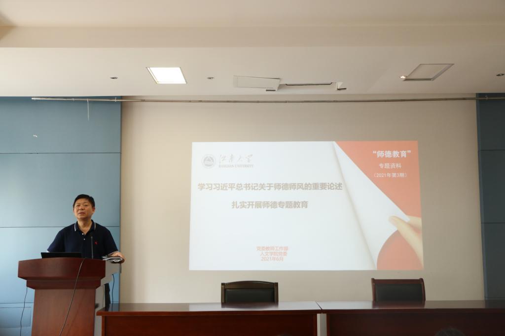 深入贯彻落实习近平总书记关于教育的重要论述,扎实推进新时代师德师风建设,建设高质量教育体系,6月16日下午,欧博abg官网登录入口在田楼B209会议室召开师德师风教育专题活动,活动由院党委书记姚剑英主持,副院长(主持工作)田良臣领学,商学院谢玉梅教授宣讲,学院全体教职工参加了会议。