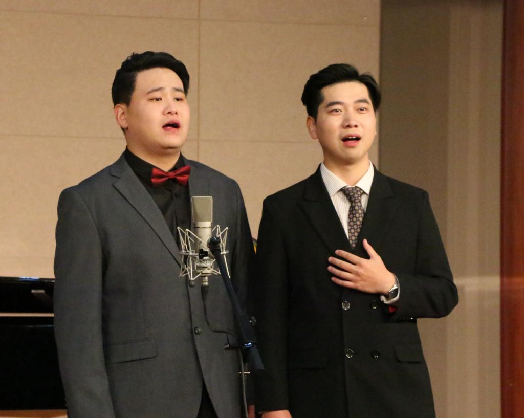 音乐会伊始,一首轻快的钢琴曲瞬间点燃全场氛围;紧接着,谈博文深情演唱《饮酒歌》,优美的旋律表达了对于爱情诚挚的追求;《你是我心中的一切》把思念化作祝福,舒缓的曲调夹杂着着淡淡的忧伤。相向合鸣,琴瑟和谐,董北辰用歌声唱出了《关雎》中先秦男女相恋的美好爱情;一首《被禁止的音乐》,细腻流畅的曲调表达了对于爱情热烈的追求。谈博文倾情演唱《青玉案》,让人仿佛身临花灯耀眼、乐声盈耳的元夕,灯火阑珊,回味无穷。董北辰用磁性的嗓音、婉转的美声让人感受到如大海般深沉的《海恋》;一首《再见了,爱恋的家》于宁静中演绎出对家的思念。