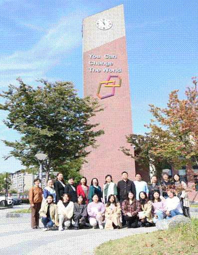 双方学校集体参会教师及欧博abg官网登录入口实习教师在滨湖双语实验中学钟楼下合影