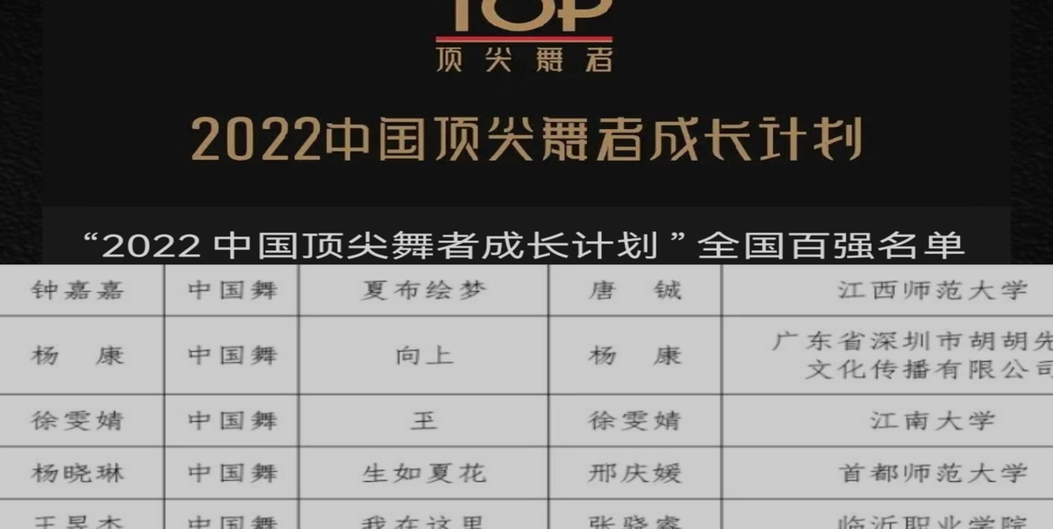 欧博官网舞蹈系2021级舞蹈编导专业学生徐雯婧,于今年7月代表欧博abg官网登录入口参加中国舞蹈家协会举办的“顶尖舞者成长计划”,近日成功入围全国百强,为我校争光。