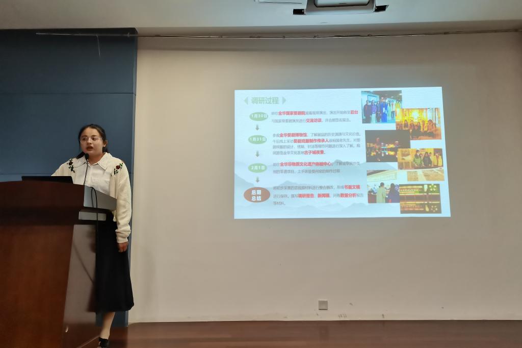 经学生自主申报、学院初评,共有3支团队、10名个人以及4个团支部进入到答辩环节。申报优秀团队的三个项目涉及“一起云支教”、“党的二十大精神宣讲”以及“行知调研”专题。其中,章驰宁同学带领的“星火相传”小队进入舟山市第一初级中学,向中学生进行“党的二十大”精神以及共青团史的宣讲;“江南遗梦”实践团展示了他们在浙江金华对婺剧进行实地考察,通过走访交流、问卷调查等形式了解婺剧这一中国非物质文化遗产的传承和保护现状,并为未来婺剧的传承和发扬提出可行性建议。