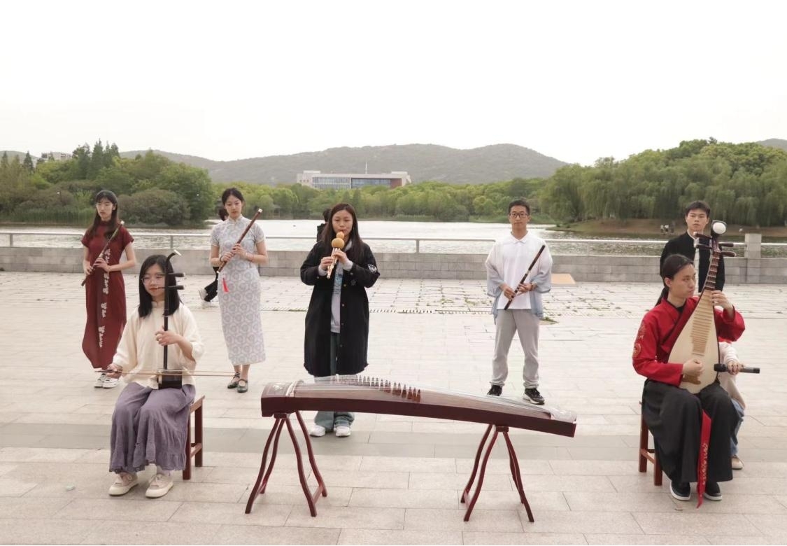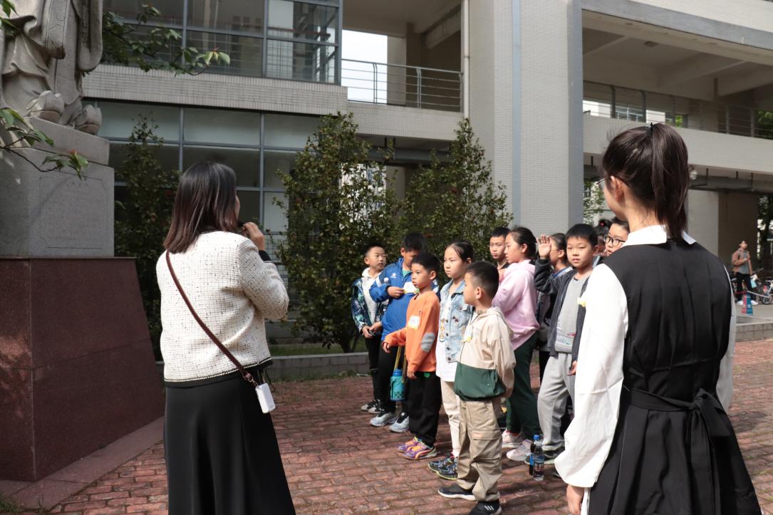 “诗文里的江南”在校园的游览中进行,小学教育本科生党支部的学生党员。孔子像前,张圆缘带领小朋友们讲述孔子幼时崇尚礼节的故事,小朋友们以孔子为榜样,模仿古代儿童入学的三拜之礼,传承“尚礼”精神。世纪广场处,蒋丽君贯通古今,引经据典,深入浅出地为小朋友们讲解了鼎的历史文化价值,一同分享与鼎相关的成语和故事。踏上曲水桥,伴随缘韵笛箫社的演奏,张心怡引导小朋友们欣赏湖边美景,伴随《忆江南》和《烟雨行舟》,小朋友们和家长在悠扬的曲韵中沉浸式体验江南美景。走向七曲桥,陈颖为小朋友们讲解桥名的来源、构造与周围的美景,引导小朋友发散思考,自主表达有关桥的诗句。这次游览,结合诗词讲解带领小朋友畅游诗画江南,是“读万卷书,行万里路”的真实性学习写照。