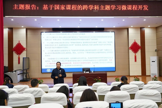 活动第二阶段,欧博abg官网登录入口副院长(主持工作)伍红林作《基于国家课程的跨学科主题学习微课程开发》主题报告。报告从跨学科主题学习的溯源、内涵、落实、困难四方面入手,引导教师理清“学科主题学习”“跨学科主题学习”概念,区分学科主题学习与其他不同类型综合学习关系,鼓励教师转变观念、积极行动,开发校本跨学科主题学习课程群。
