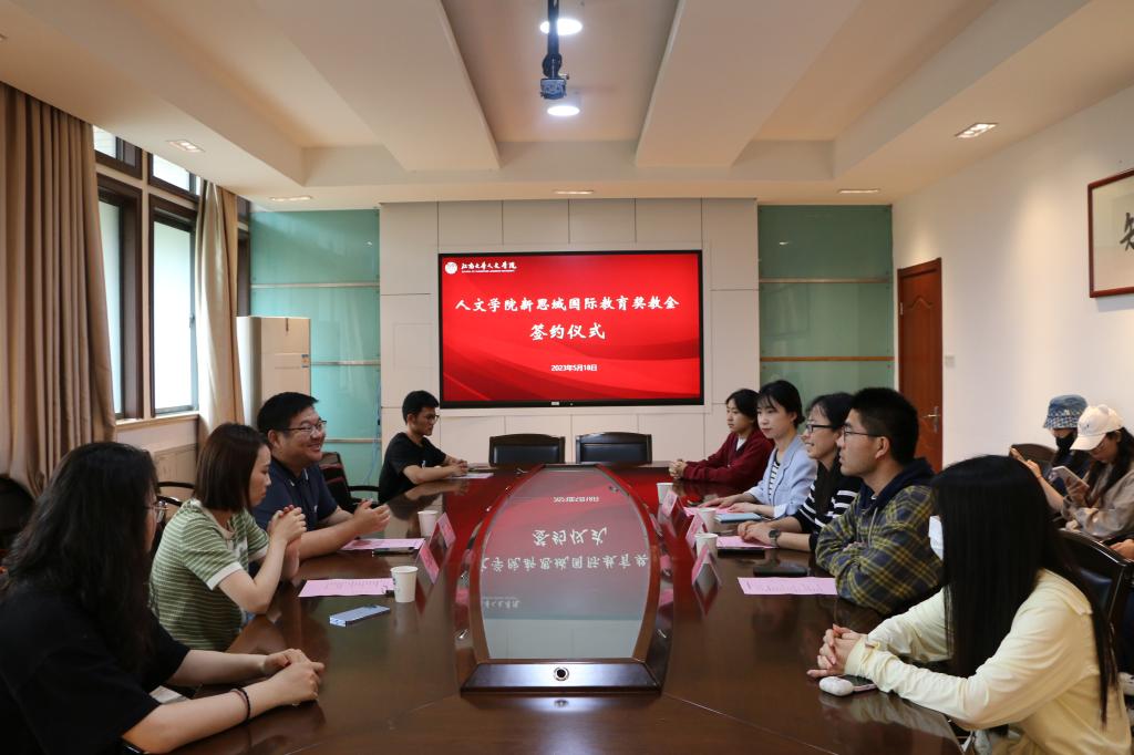 5月18日下午,欧博abg官网登录入口“新思域国际教育奖教金”捐赠签约仪式在田家炳楼207会议室顺利举行。无锡新思域集团总经理王斌、副总经理杜皎阳,欧博abg官网登录入口党委副书记、副院长李萍,辅导员代表及欧博abg官网登录入口有海外交流意向的学生代表共同参加了本次活动。签约仪式由辅导员李婉婷主持。