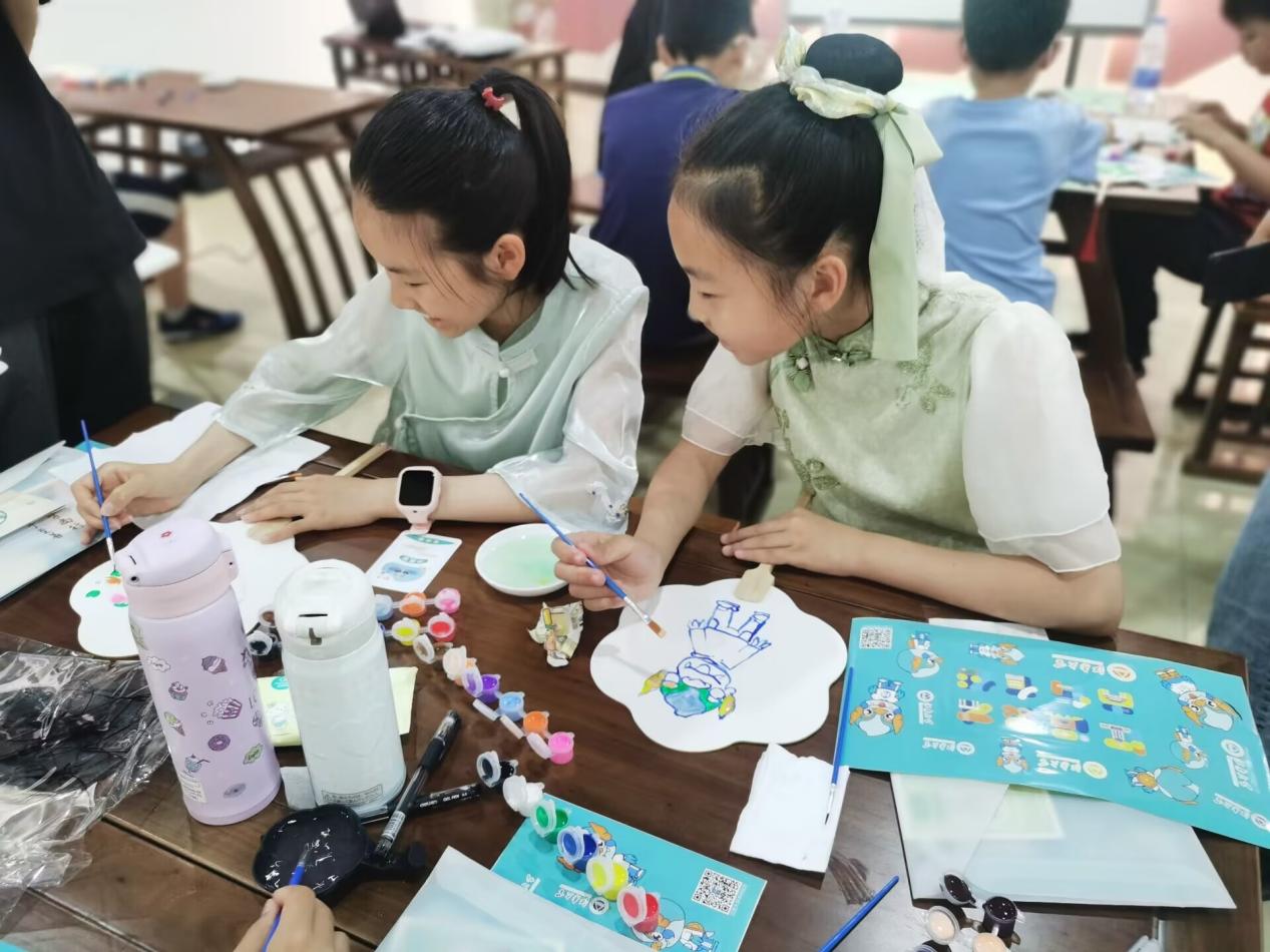 带着收集到的夏日诗词拼图,小朋友们来到欧博abg官网登录入口田家炳楼陈列展览室,本期活动的第二个环节“诗意江南,巧画罗扇”在这里进行。于祥涛、王晓昀通过“解诗词”、“辨节气”、“诵诗词”三个环节的讲述,带领小朋友们在诗词中寻觅夏日、体味文化。初夏胜景,诗词共赏,现场师生、家长们随着主讲人的讲解一起品读、赏析,在诗词中感受夏日的美好。李同欣、胡高菡带领小朋友们在游历了江南夏景、诵读了夏日诗词之后,拿起彩笔,在中国传统工艺品团扇上,绘出自己心里的夏日风光。在赠书环节中,小朋友们写下祝福与问候,这份爱心将会在暑期由欧博abg官网登录入口支教团带给山区小朋友。