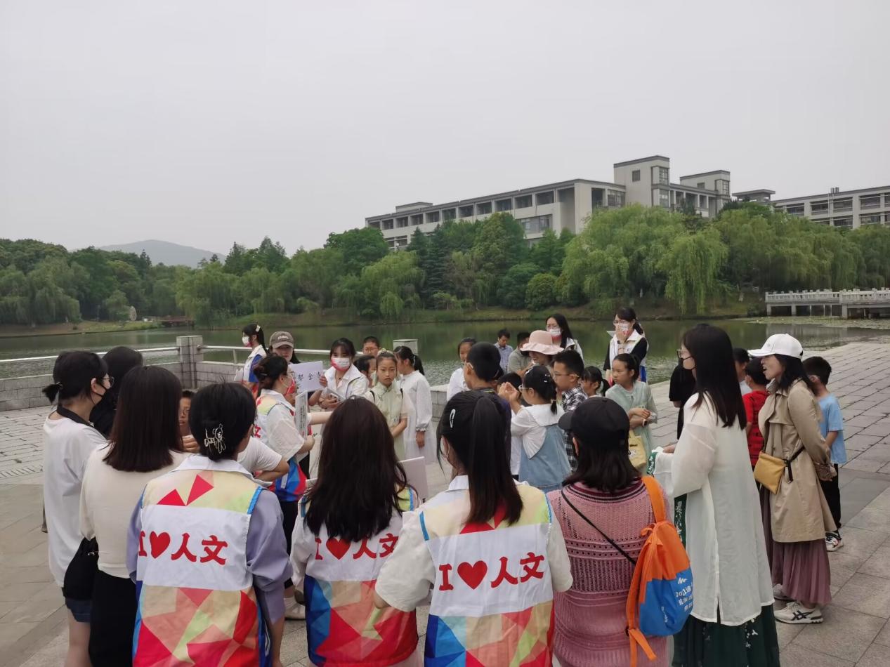 “游学江南,探秘初夏”环节伴随校园游览展开,小朋友们以追寻夏日拼图为己任,分成两个小组,在学生党员的引导下踏上游学之旅。第一站“夏日飞花,捕捉初夏”,小朋友们来到钱穆像前,跟随讲解感悟钱氏家风,以“飞花令”的形式在诗词中寻找夏天,漫谈夏日光景。第二站“儒风国运,映古辉今”,小朋友们走近孔子像,学习国学精粹,弘扬华夏文明,在知识抢答环节中获得诗词拼图。第三站“默契考验之你画我猜”,小朋友们来到小蠡湖学海无涯广场,在这里默契互动,探秘初夏的江南。第四站“投壶会友”,小朋友们来到世纪广场,在了解鼎的历史故事后,投壶辨诗句。本次沉浸式的体验,让小朋友们在亲近自然的同时,体验诗词魅力,激发了学习古诗词的热情。