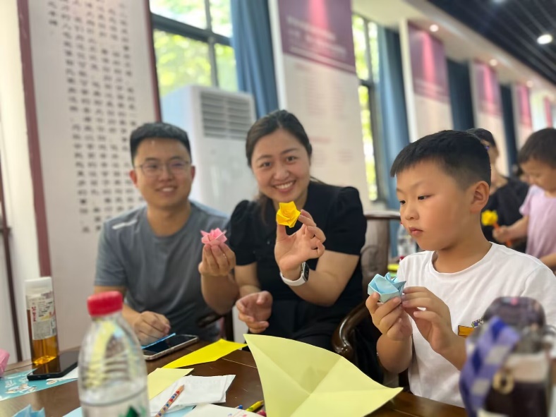 在“指尖上的玫瑰”环节,参与活动的家长和小朋友一起在志愿者们的带领下折纸玫瑰,指尖翩飞下,一朵朵纸玫瑰绽放在每个人的手上。小朋友们将自己折好的玫瑰花高高举起,送给自己的父母以及老师,并勇敢表达自己的爱意。