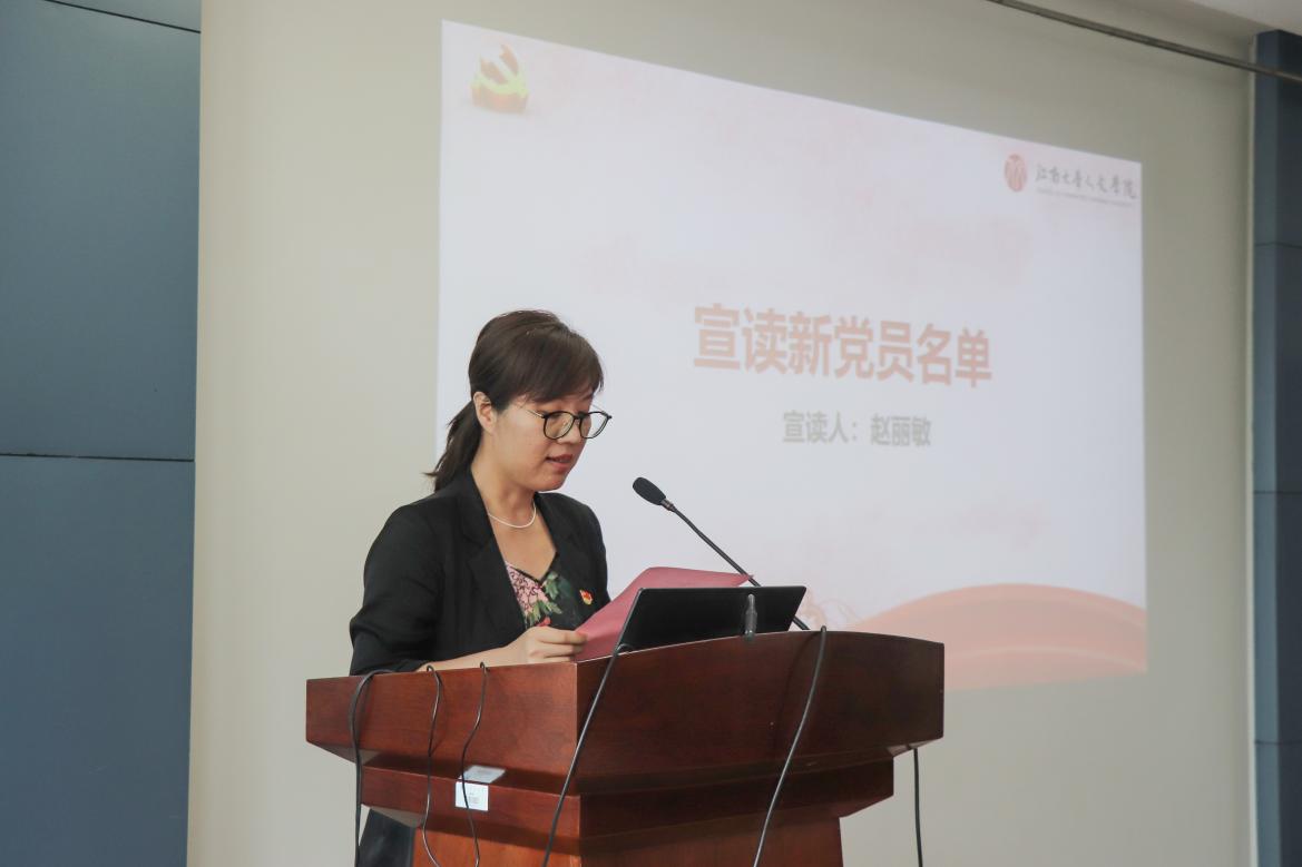 宣誓仪式在《国际歌》中拉开帷幕幕。首先,由分团委书记赵丽敏宣读本学年新发展党员名单。随后,面对鲜艳的党旗,欧博abg官网登录入口党委副书记、副院长李萍带领新党员举起右拳,庄严宣誓,铮铮誓言表达传承初心使命、勇担重任在肩的决心。