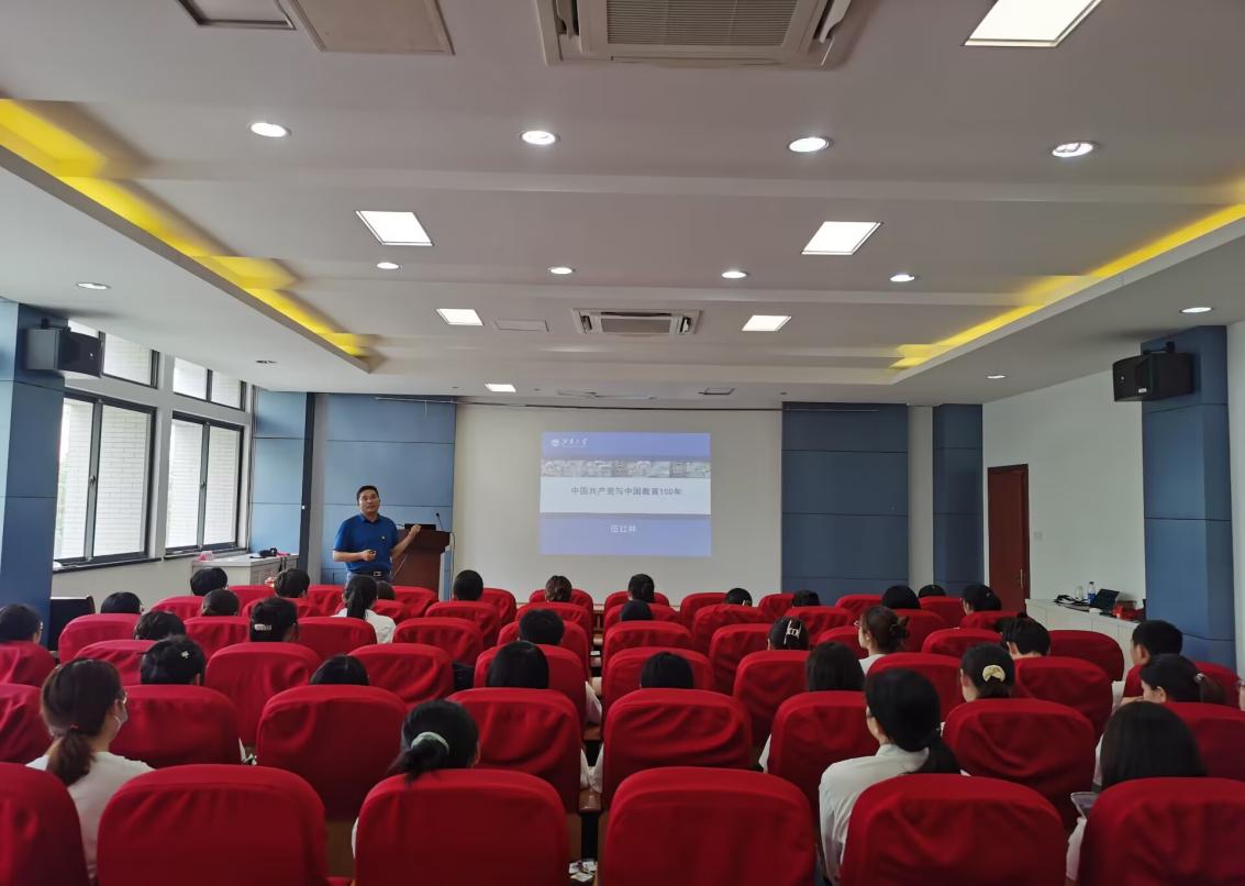 最后,伍红林院长为新党员讲授专题党课《中国共产党与中国教育100年》,围绕中国共产党领导教育事业的百年奋进历程、主要成就和高质量发展展开讲述,鼓励新党员们提高政治站位,学思想、重实践,努力学好专业知识,把握中国基础教育发展大势,为建设教育强国担当作为、贡献力量。