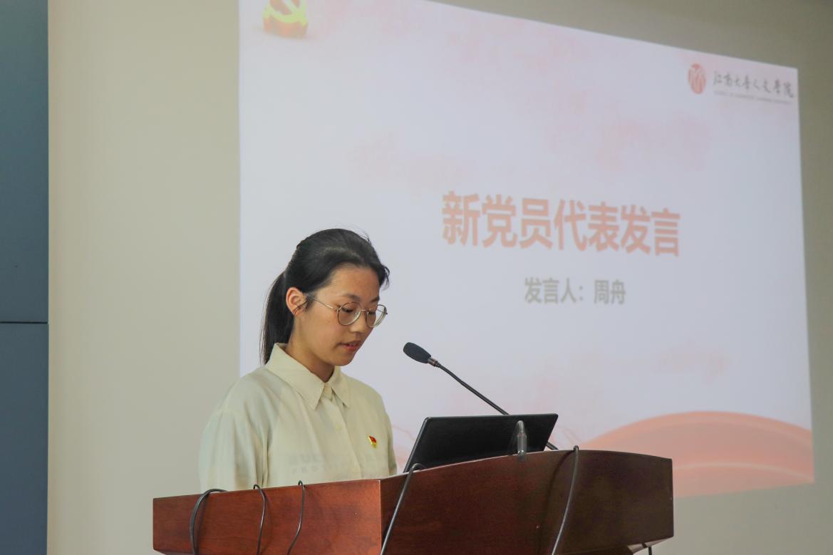 接下来,新党员代表周舟结合青年一代继往开来、接续奋斗的使命担当,抒发了对革命先辈的崇高敬意,表示将时刻谨记入党誓言和共产党人的初心使命,不断加强党性修养,进一步坚定理想信念,凝聚奋进力量,做到听党话、感党恩、跟党走,为实现中华民族伟大复兴的中国梦贡献青春力量。