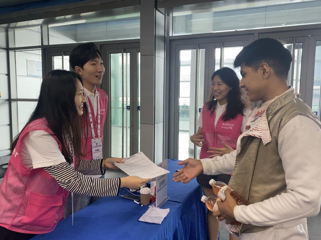 赛事开始前,志愿者们已经进行了亚洲击剑锦标赛的基本情况、颁奖流程、志愿者服务礼仪规范、志愿者安全自护教育等内容的专业培训。赛事期间,志愿者们分散在不同服务点,报道处志愿者协助酒店报到处负责人,帮助办理运动员入住以及物品分发;颁奖协助志愿者负责证书奖牌奖杯的分配,以及国旗的确认;剑道志愿者进行赛场录像回放,帮助裁判员计时记分……比赛现场,人文学子充分展现出欧博官网青年志愿者的青春风采,助力赛事有序进行。