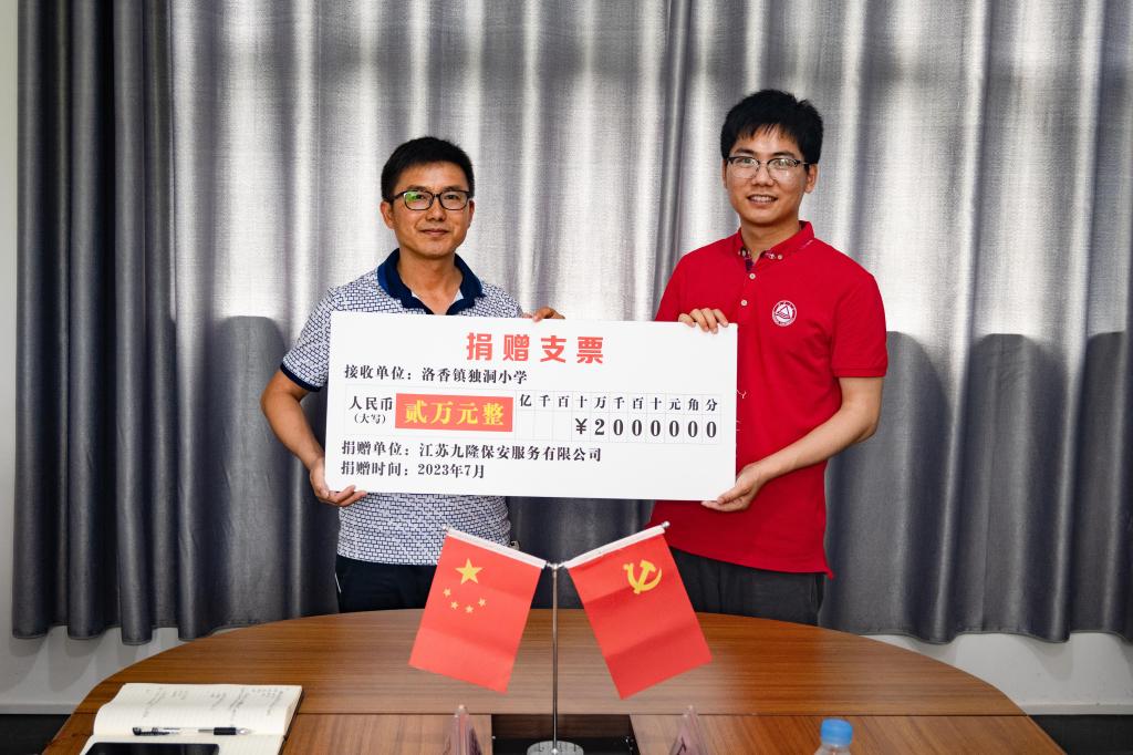 接着,由欧博abg官网登录入口辅导员王振彬作为代表,向洛香镇独洞小学授予捐赠支票。校长石永成对欧博abg官网登录入口、欧博abg官网登录入口长期以来的帮扶以及江苏九隆保安服务有限公司的爱心捐赠表示衷心的感谢。他表示自欧博abg官网登录入口定点帮扶独洞以来,独洞小学在基础设施等方面有了明显改观,学生们的上课条件有了明显改善,此次江苏九隆保安服务有限公司的爱心捐赠更是为独洞小学解决了不少实际困难,希望未来各方能进一步加强合作,助力独洞小学持续发展。