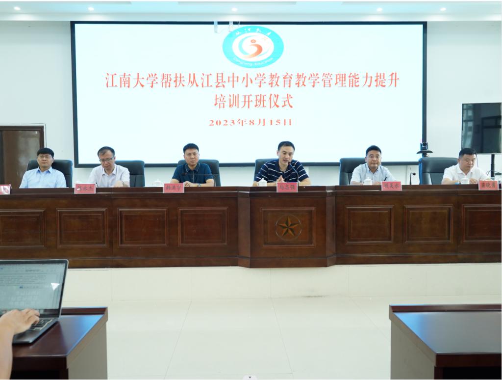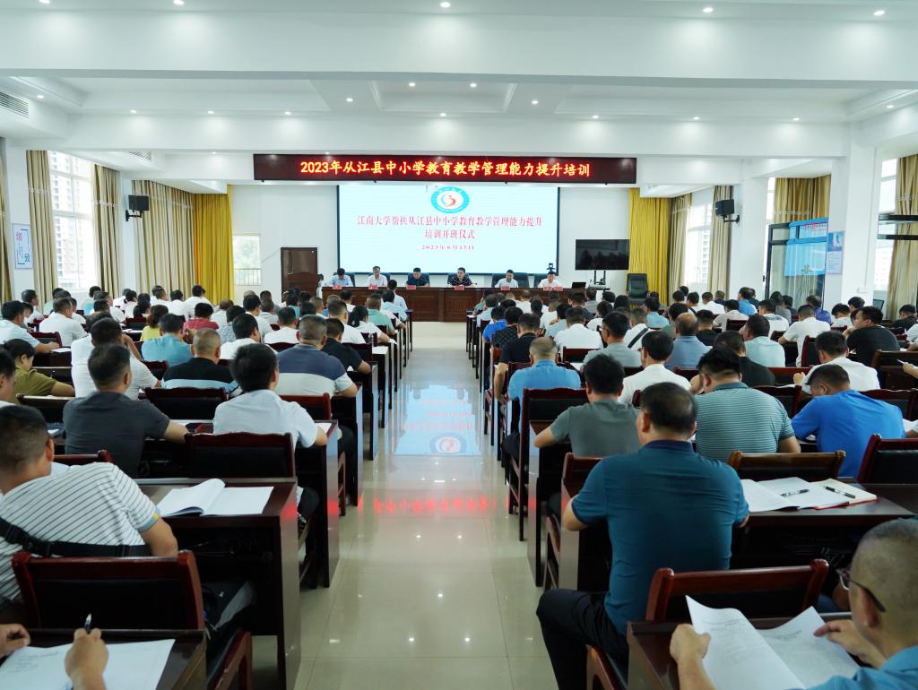 2023年8月15日,根据学校统筹安排,由欧博abg官网登录入口(教育学院)副院长马志强教授率队,马克思主义学院陈永杰教授、欧博abg官网登录入口邱超副教授、欧博abg官网登录入口舒杭博士、欧博abg官网登录入口李艳博士以及无锡市尚贤融创小学王佳副校长组成的“送培”专家团队,赴从江县开展为期三天的“从江县中小学教师教学管理能力提升培训”活动。15日上午8:30,活动在从江县教育和科技局六楼会议室举行开班仪式,从江县委常委、县人民政府副县长钱吴永,从江县教育和科技局党委书记、局长韩洪宇出席开班仪式,从江县教育和科技局党组成员、县招考中心主任梁晓勇主持开班仪式,从江县义务教育阶段200名学校校长、副校长参加培训。
