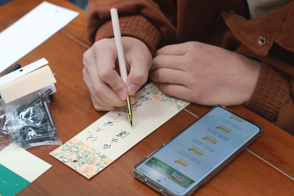 “瓦舍小集”部分包含五个互动环节。“汉服体验”环节,回答汉服有关的小问题,有机会现场体验汉服穿搭,体验古人“织为云外秋雁行,染作江南春水色”的风味;“雁字回时”环节,师生纷纷在金秋书签上写下了自己的心愿、情意,留作纪念;“茅塞顿开”猜识甲骨文环节,挺拔遒劲,古朴空灵的甲骨文字让人们仿佛穿越时空,体会古人造字的魅力;“白羽飞矢”投壶环节,再现千年前文人墨客“射者中,奕者胜”的喜悦;“合字成诗”环节,参与师生在诗词九宫格中任选五字或七字组成一句完整的诗词,各逞巧思,徜徉在诗的海洋。