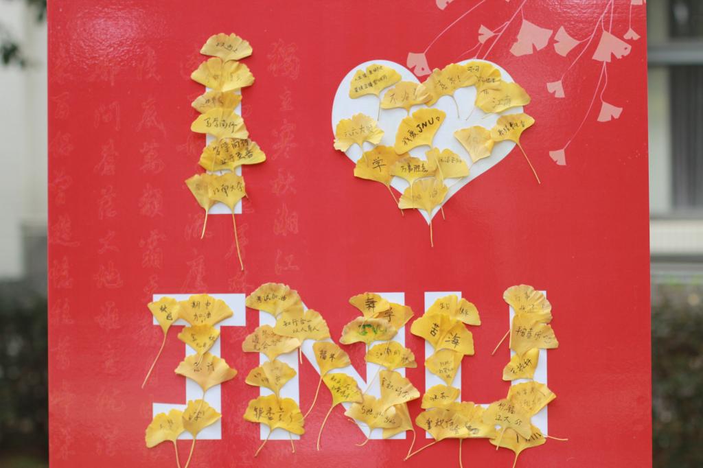 满地翻黄银杏叶,满园银杏落秋风。银杏大道上,大人孩子们拾取落叶,制作属于自己的银杏书签,大家一起工笔细描,粗笔皴染,绘山描水,织木画鸟。近日恰逢欧博abg官网登录入口建校65周年,师生校友纷纷将对母校的祝福写在银杏叶上,拼成“I❤️JNU”的字样,表达对母校最真挚的情意。