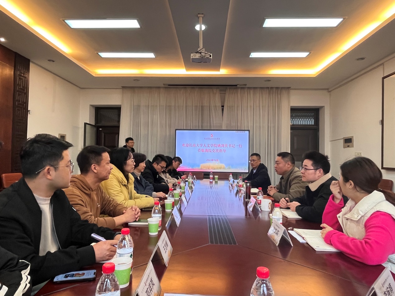 浙江师范大学欧博abg官网登录入口党委书记吴洪涛,副书记陈海峰对欧博abg官网登录入口一行来访表示热情欢迎,并介绍欧博abg官网登录入口的学科发展、人才引育、科研平台、文化建设等情况。姚剑英对欧博abg官网登录入口的接待表示感谢,并介绍了欧博abg官网登录入口的发展历史、党建工作、学科建设和人才培养情况。交流会上,吴洪涛和陈海峰分享了党建工作和学生思想政治教育的相关情况和经验。双方就标杆院系、样板支部、双带头人教师党支部书记工作以及人文类学科专业的建设等问题开展了深入交流。