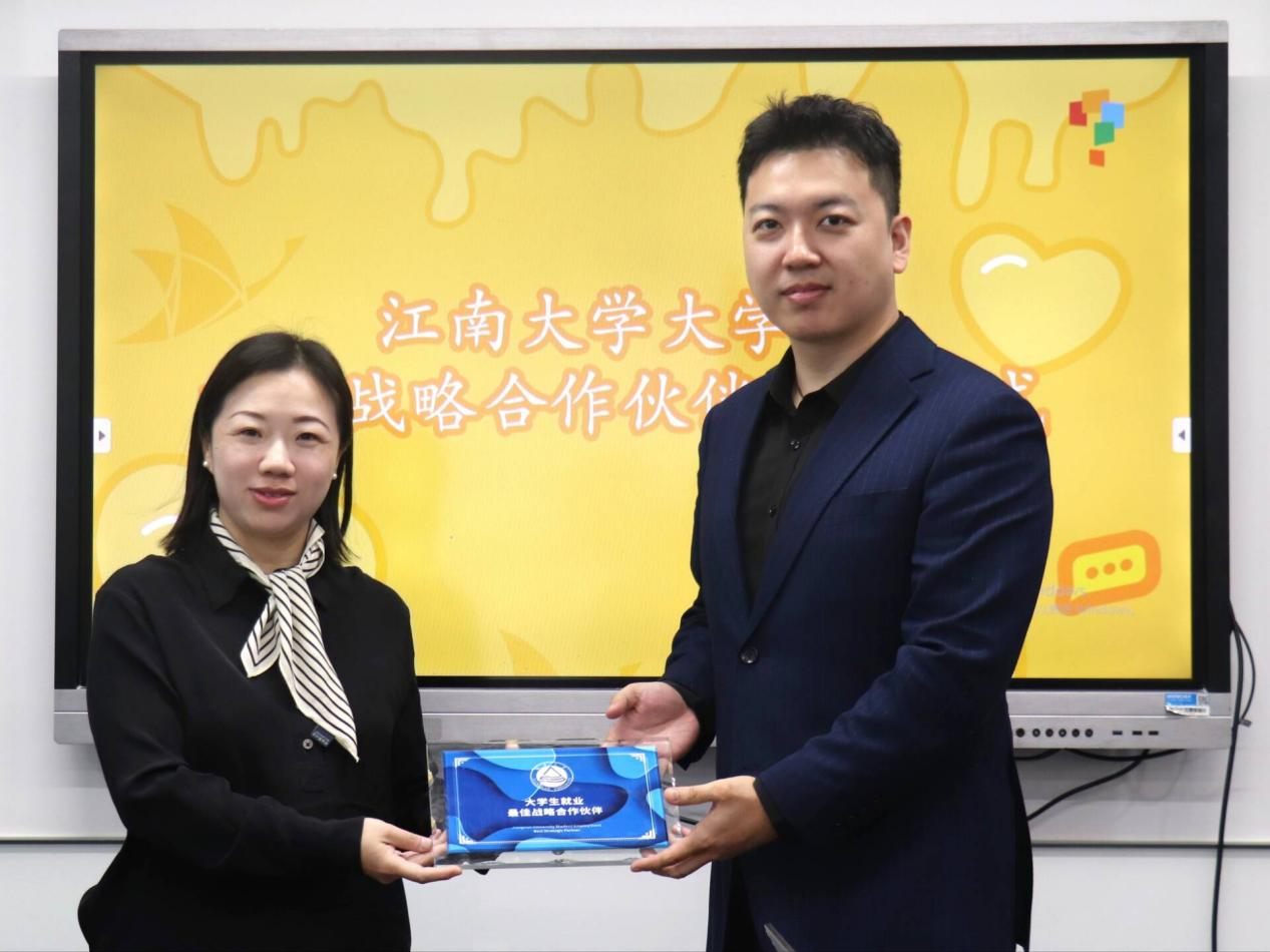 随后,王晖基于双方的教育理念、人才需求、发展规划、科研合作等方面展望了未来校企合作愿景,她指出高校要在精准就业的基础上推动高质量就业,期待双方建立长期、稳定的合作机制,提高人岗适配程度,为学生提供更优质的就业机会和更广阔的发展平台。最后,王晖为杭州学而思与浙江新东方颁发“大学生就业最佳战略合作伙伴”铭牌,并合影留念。