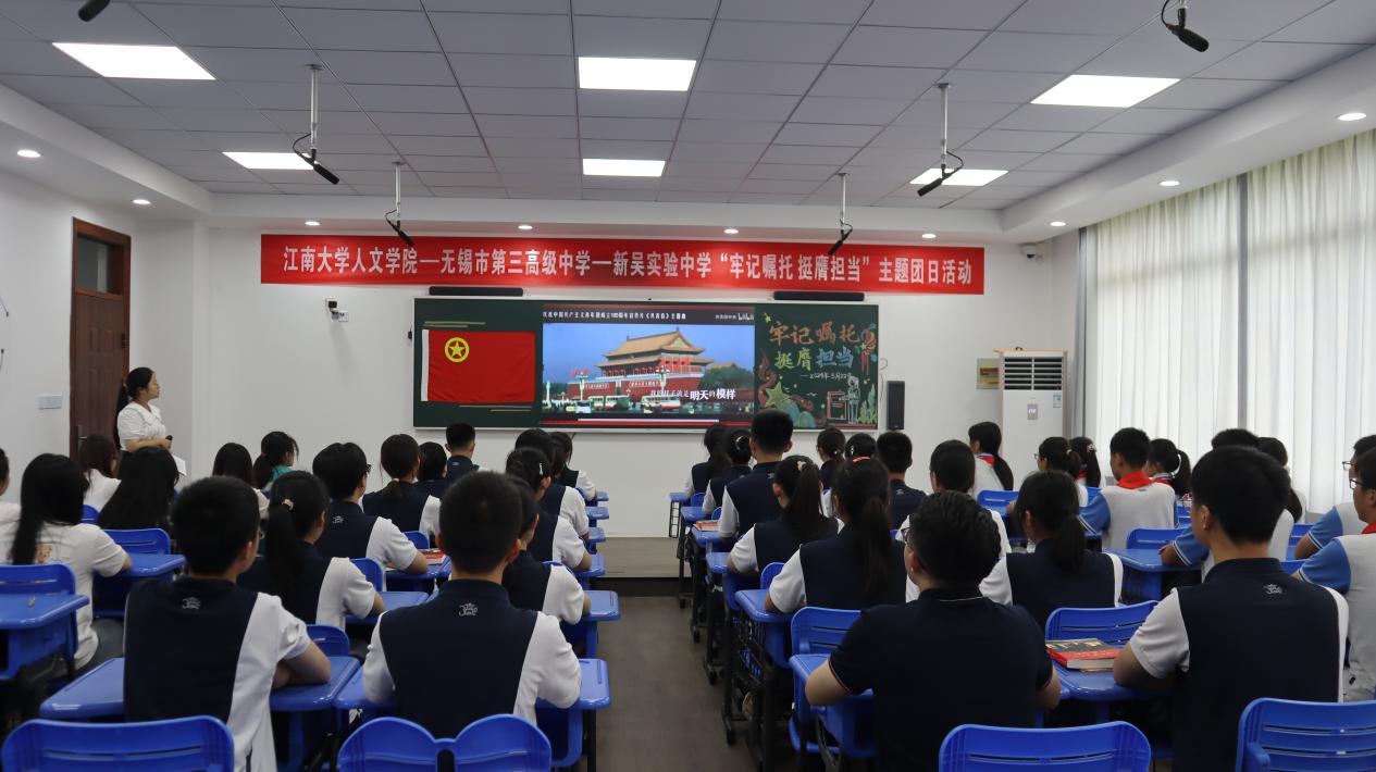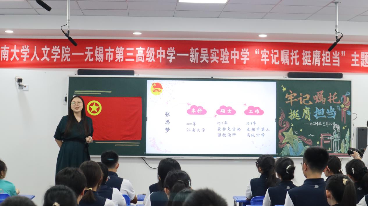 为深入学习习近平总书记五四重要寄语精神,近日,欧博abg官网登录入口青年马克思主义者培养工程第六届培训班学员赴无锡市第三高级中学参加“牢记嘱托、挺膺担当”主题团日活动,与无锡市第三高级中学、新吴实验中学的60余名团员代表们共同学习习近平总书记五四青年节对全国广大青年寄语精神,畅谈《习近平与大学生朋友们》读书心得,分享成长经历和感悟。